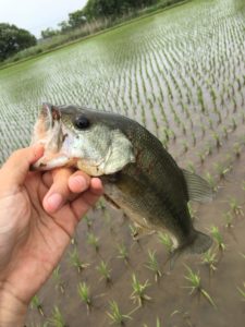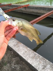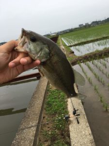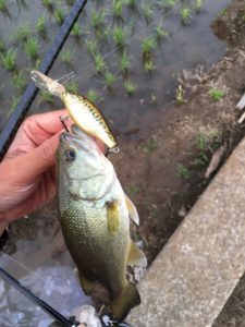 確認程度にゆっくりロッドを煽るとなんと15cm位の小バス。。。
