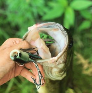 トップを投げたいけど、トリプルフックじゃ引っかかるしスピニングだから重いのは投げられないしで唯一手元にあったルアーはフロッグ。